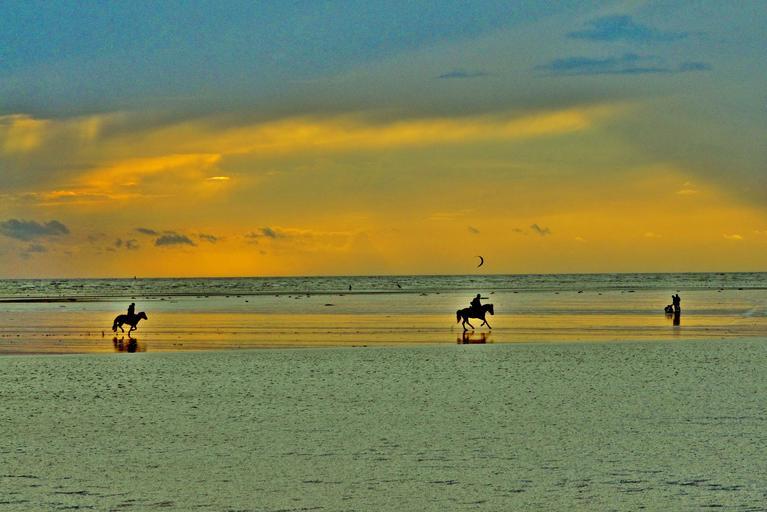 Keywords: ride reiter horses gallop north sea sunset nordfriesland dike beach