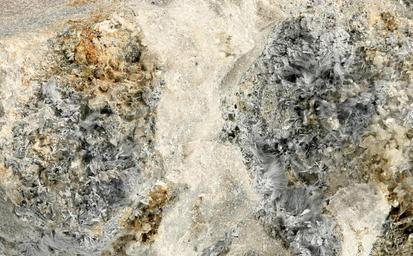 | Keywords: Riebeckite, Calcite, Dolomite, Donnayite group-262219.jpg FOV ~ 4 5 cm wide Found 1996 This is from hornfels and MSH collectors call it riebeckite - but it has not been analyzed This material is found abundantly but infrequently It may be under collected because it's rather ugly when wet and muddy - as if often the case But when cleaned up the blue color is quite attractive There are some very small calcite cones and translucent dolomite rhombs esp top There are also quite a few gray donnayite group pagodas with white caps Likely these are ewaldite with donnayite- Y In any case they are too small to make out in the photo Riebeckit Sichtfeld ~ 4 5 cm breit Fundort Poudrette quarry Demix quarry; Uni-Mix quarry; Desourdy quarry Mont Saint-Hilaire Rouville RCM Montérégie Québec Kanada http //www mindat org/photo-262219 html 2008-09-21 http //www mindat org/user-11235 html 0 Modris Baum Modris Baum Riebeckite Calcite Dolomite Donnayite Files by Modris Baum from mindat |