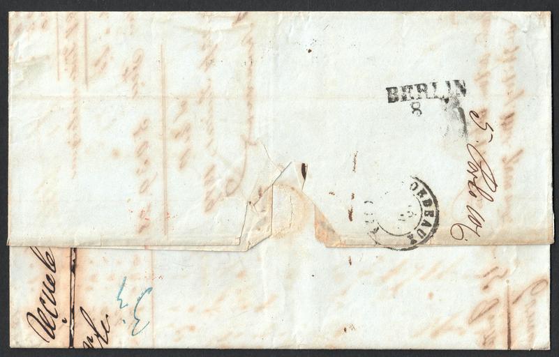 | Keywords: Riga 1849 Dob40118 reverse.jpg en Russian Latvia reverse of stampless folded unpaid letter to France 'Рига 22 юнь 1849' RIGA June 22 1849 cancel handstamp 'AUS RUSSLAND' 'PRUSSE/3/VALENCIENNES 11 JUIL 49' manuscript '40' decimes rate Reverse BERLIN/8 7 transit arrival backstamp 'Bordeaux' Details June 22 Julian or July 4 Gregorian 1849 unpaid letter posted at Riga The weight was assessed expressed as 40 decimes and manuscript '40' applied Reverse restated by manuscript '5 Porto 10' 'RIGA June 22 1849' postmark applied; Dobin 40 type 1 18 Transit postmark for foreign mail used from 1848-1850 July 8 Gregorian 'BERLIN 8 7' typical Berlin transit postmark and 'AUS RUSSLAND FRANCO' applied Based on the usual presence of these Berlin postmarks this 'AUS RUSSLAND FRANCO' marking is regarded as a Berlin mark White Aus Russland type B4 found from 1844-January 1846 mail coach period and from early 1848 to October 1849 railroad period July 11 Gregorian French entry mark mail from Prussia Prusse entering France at Valenciennes The small 3's show this mark was struck at Paris July 13 32 Bordeaux arrival backstamp Recipient had to pay 40 decimes for the letter 1849-07-04 own scan Post of Russia other versions See more images Riga 1849 Dob40118 01 jpg Riga 1849 Dob40118 reverse jpg Riga 1849 Dob40118 content jpg LangSwitch Russian Latvia 1849 stampless folded unpaid letter to France Custom license marker 2016 05 23 PD-old-100 Stampless covers of Russia Covers of Russia 1849 Stampless covers of Latvia 1849 in the Russian Empire Entry and transit postmarks of Germany Postmarks of Berlin 1849 postmarks |