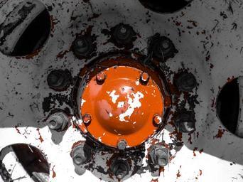 Keywords: rim tire wheel round rims tires bolts nuts metal white steel mechanical orange truck transportation trucks fort myers florida