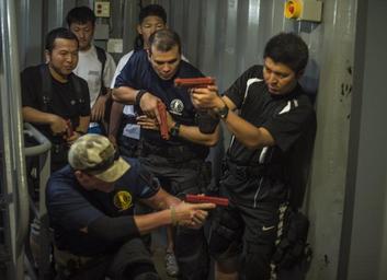 | Keywords: RIMPAC 2014 VBSS training 140702-N-PX130-121.jpg en Japan Maritime Self Defense Force sailors from JS Kirishima DDG 174 and JS Ise DDH 182 practice Visit Board Search and Seizure techniques with instructors from the Center for Security Forces Detachment Pearl Harbor during Rim of the Pacific RIMPAC Exercise 2014 The world's largest international maritime exercise RIMPAC provides a unique training opportunity that helps participants foster and sustain the cooperative relationships that are critical to ensuring the safety of sea lanes and security on the world's oceans Twenty-two nations more than 49 ships six submarines more than 200 aircraft and 25 000 personnel are participating in RIMPAC U S Navy photo by Mass Communication Specialist 1st Class Daniel Gay/Released 2014-07-02 Petty Officer 1st Class Daniel Gay https //www dvidshub net/image/1434327 140702-N-PX130-121 2014-07-03 23 44 FORD ISLAND HI US PD-USGov-Military-Navy JS Ise DDH-182 RIMPAC 2014 Images from DoD uploaded by Fæ |
