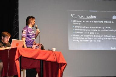 | Keywords: Rino Rondan, con la vestimenta post-break para almorzar, del sábado, en PampaSeg 2015. Sin sombrero, con la camiseta de Club Villa Dalmine, habla sobre el uso de SELinux en los modos enforcing, permissive y disabled. fedora selinux pampaseg |