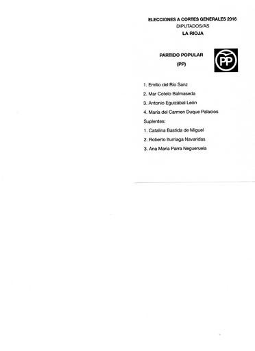 | Keywords: Rioja pp generales 2016.jpg es Papeleta electoral de Partido Popular PP para el Congreso - Elecciones Generales de España de 2016 circunscripción de La Rioja 2016-08-05 own B25es other versions cc-zero PD-SpanishGov <br/> De minimis The party logo Ballot papers for the 2016 general election for La Rioja Spain Ballot papers for Partido Popular Uploaded via Campaign bpsge |