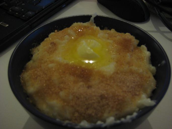 | Keywords: Risengroed.jpg Bowl of rice pudding Rice pudding boiled on milk and served with a knob of butter and a sprinkle-mix of sugar and powdered cinnamon is a traditional Christmas food in Denmark The dish is called 'Risengrød' in Danish translating as rice-poridge In previous times a bowl was placed in the attic in December as an offering to calm the supernatural creature called 'Nissen' an unpredictable and often very grumpy creature of Danish and Scandinavian folklore own Taken by myself 2008-01-24 Morten Spleth Heidemann Gregersen Christmas food of Denmark Risengrød |