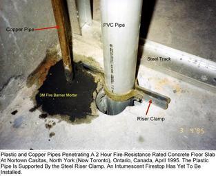 | Keywords: Riser clamp.jpg Riser Clamp Holding Plastic Pipe Penetrating Through Concrete Floor Slab The Copper Pipe Penetration Is Firestopped With Firestop Mortar Own 2007-08-22 Achim Hering Riser clamps Cement Plumbing Operable firestops Copper pipes 3M Fire Barrier Mortar |