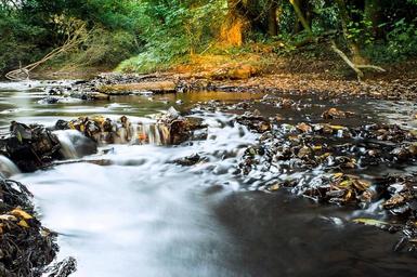 Keywords: river bach water flow idyllic waters trees fall leaves nature creek stones splash water running in evening light mood natural aesthetic