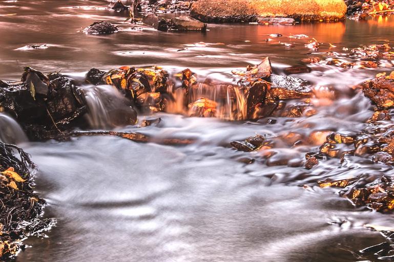 Keywords: river bach water flow idyllic waters fall leaves nature creek stones splash water running in evening light mood