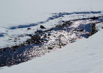 Keywords: river bach water mirroring winter landscape snow snowy sunny