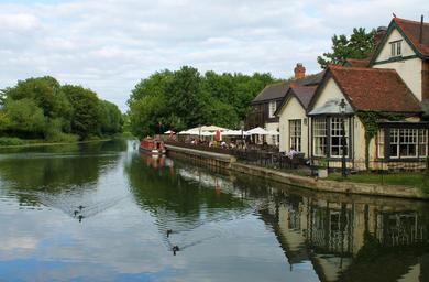 Keywords: river building restaurant water tourism outdoors travel riverside boat sky pub riverbank uk europe scene old colorful trees historic
