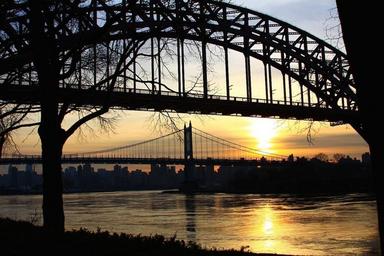 Keywords: river dusk twilight sunset bridge city building skyline tree