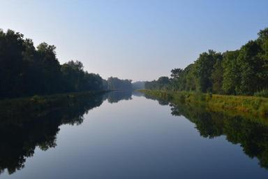 Keywords: river mirroring water nature trees channel reflection fog smooth blue green mood clear quiet