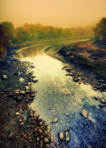 Keywords: river mist landscape fog reflections horizon rocks water fall color hot