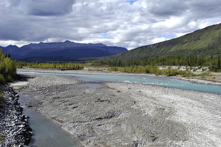 Keywords: river mountains landscape nature river bed sediments sky clouds
