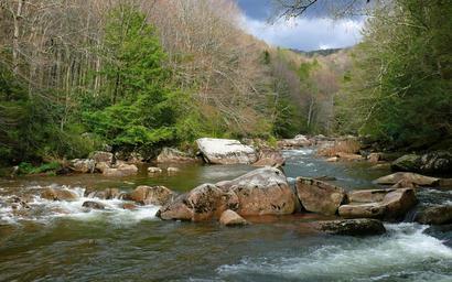 Keywords: river rapids landscape edge rocks plants nature water mountains sky clouds forest trees boulders running beautiful tranquil scenic outside outdoor