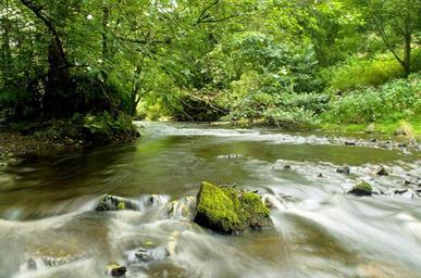 Keywords: river water rock rocks element tree green leaves branches branch stream flow summer seasons north yorkshire england nature