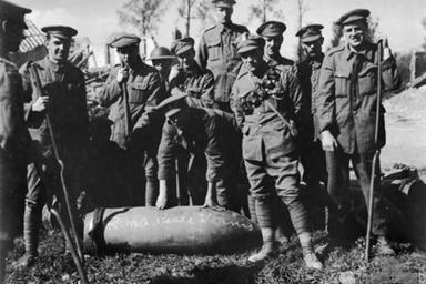 | Keywords: RMAGunnersAnd15inchHowitzerShellYpresOctober1917.jpeg The unidentified crew of a Royal Marine Artillery 15 inch howitzer supporting the Australians Note the writing on the shell 'RMA Peace Germies' This is an original Paget Plate negative The same image is available in colour and is held at P03631 206 <br>Place made Western Front Western Front Belgium Ypres Area Ypres E02082 1917-10 Frank Hurley Copyright clear PD-AustraliaGov World War I Photographs by Frank Hurley BL 15 inch Howitzer Ammunition World War I artillery ammunition BL 15 inch howitzer Third Battle of Ypres BL 15 inch howitzer World War I forces of Britain in Belgium Ypres 1917 Royal Marine Artillery Puttees Black and white photographs |