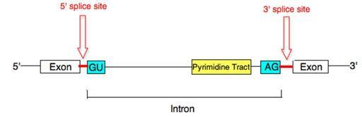 Keywords: RNA Splicing-Splice Sites.png en Splice sites indicated by GU and AG own Mlicuana 2010-11-21 Biochemistry