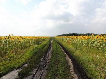 Keywords: road after the rain sunflower sunflowers clouds sky puddles dirt beauty in nature landscape