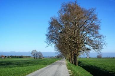 Keywords: road away trees avenue nature wide distant spring landscape bavaria chiemgau holiday recovery meadow green pasture