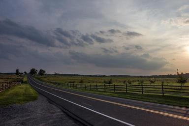 Keywords: road clouds pasture fence picket fence sky landscape travel horizon trip transport sunset field sunrise perspective grass country
