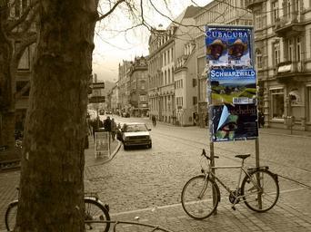 Keywords: road cobblestones homes facade architecture building wall old town paving stone structure freiburg advertising advertising poster poster bike tree tribe
