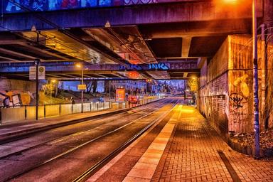 Keywords: road graffiti tram stop art wall underpass mural evening abendstimmung