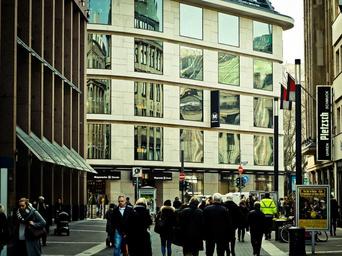 Keywords: road mirroring architecture building facade window city housewife glass glass front human pedestrian zone shopping düsseldorf urban