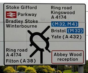 | Keywords: Road.sign.arp.750pix.jpg A road sign near Bristol England The direction sign is patched according to the Guildford Rules It gives directions to Bristol Parkway railway station red British Rail symbol motorways blue-background patches and towns reached via non-primary A-roads Red-edged patches and red-bordered signs are used for military establishments the Ministry of Defence at Abbey Wood in this example Destinations which are reached indirectly have the corresponding road number in brackets; for instance this sign says that Filton is reached by following the A4174 ring road to the A38 and then turning onto the A38 for Filton Taken by Adrian Pingstone in October 2004 and released to the public domain 2004-10 User Arpingstone on http //en wikipedia org en wikipedia page is was here <nowiki> 19 06 8 October 2004 Arpingstone 750×624 110 953 bytes <span class comment > Road Sign </span> </nowiki> Road signs in England |