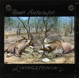 | Keywords: Roan Antelope, Africa, ca.1875-ca.1940 (imp-cswc-GB-237-CSWC47-LS16-025).jpg en <br> Roan Antelope Africa ca 1875-ca 1940 Photograph of two roan antelope a savannah antelope named for their reddish colour and found in West Central East and Southern Africa ; This belongs to a series of Church of Scotland Foreign Missions Committee lantern slides relating to David Livingstone 1813-1873 the Scottish missionary who was best known as an explorer of Africa and anti-slavery campaigner Livingstone was born in Blantyre Scotland and after working in the local cotton mill from the age of 10 he went on to study medicine and theology in Glasgow in 1836 Having decided to become a missionary he was posted to southern Africa in 1841 In 1845 he married Mary Moffat During his life Livingstone carried out exploration of southern eastern and central Africa he discovered and named the Victoria Falls and it was his meeting with H M Stanley during a search for the source of the Nile that gave rise to the popular quotation Dr Livingstone I presume David Livingstone died in Africa on 1 May 1873 and his body was buried in Westminster Abbey Photographer Unknown Subject personal name Livingstone David 1813-1873 Filename imp-cswc-GB-237-CSWC47-LS16-025 tif Coverage date circa 1875/1940 Part of collection International Mission Photography Archive ca 1860-ca 1960 Type images Part of subcollection Photographs from the Centre for the Study of World Christianity University of Edinburgh U K ca 1900-ca 1940s Repository name Centre for the Study of World Christianity Archival file impaunpub_Volume7/1858 url Repository address The University of Edinburgh School of Divinity New College Mound Place Edinburgh EH1 2LX United Kingdom Format aacr2 1 lantern slide 8 x 8 cm Geographic subject continent Africa Rights Contact the repository for details Part of series David Livingstone LS16 Repository email divinity-CSWC ed ac uk Subject lcsh Keyword Animals Date created circa 1875/1940 Publisher of the digital version University of Southern California Libraries Subject aat genre portraits Format aat lantern slides Legacy record ID impa-m69438 Access conditions http //www ed ac uk/schools-departments/divinity/research/centres/world-christianity/collections-resources File GB 237 CSWC47/LS16/25 circa 1875 /1940 author http //digitallibrary usc edu/cdm/ref/collection/p15799coll123/id/64974 PD-old-70-1923 Magic lantern images Images from USC Digital Library uploaded by Fæ International Mission Photography Archive ca 1860-ca 1960 |