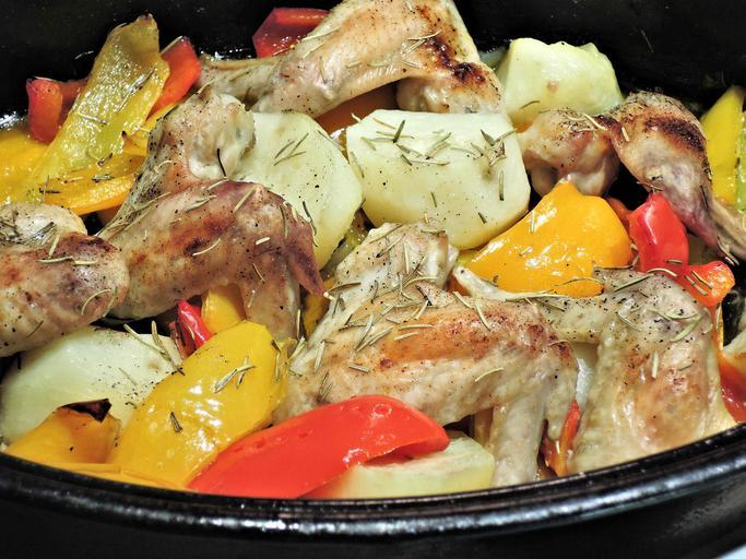 Keywords: roasted pepper stew chicken wings potatoes rosemary garlic oil food meal dish dinner