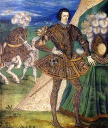 | Keywords: Robert Devereux, 2nd Earl of Essex (10 November 1565[1] – 25 February 1601), is the best-known of the many holders of the title "Earl of Essex." He was a military hero and royal favourite of Elizabeth I, but following a poor campaign against Irish rebels during the Nine Years' War in 1599, he failed in a coup d'état against the queen and was executed for treason. Essex was born on 10 November 1565 at Netherwood near Bromyard, in Herefordshire, the son of Walter Devereux, 1st Earl of Essex and Lettice Knollys. His maternal great-grandmother Mary Boleyn was a sister of Anne Boleyn, mother of Queen Elizabeth I, making him a cousin of the Queen, and there were rumours that his grandmother, Catherine Carey, a close friend of Queen Elizabeth's, was Henry VIII's illegitimate daughter.[3] He was brought up on his father's estates at Chartley Castle, Staffordshire and at Lamphey, Pembrokeshire in Wales and educated at Trinity College, Cambridge.[4] His father died in 1576, The new Earl of Essex became a ward of Lord Burghley. On 21 September 1578 his mother married Robert Dudley, Earl of Leicester, Elizabeth I's long-standing favourite and Robert Devereux's godfather.[5] Essex performed military service under his stepfather in the Netherlands, before making an impact at court and winning the Queen's favour. In 1590 he married Frances Walsingham, daughter of Sir Francis Walsingham and widow of Sir Philip Sidney, by whom he was to have several children, three of whom survived into adulthood. Sidney, Leicester's nephew, died at the Battle of Zutphen in which Essex also distinguished himself. Essex first came to court in 1584, and by 1587 had become a favourite of the Queen, who relished his lively mind and eloquence, as well as his skills as a showman and in courtly love. In June 1587 he replaced the Earl of Leicester as Master of the Horse.[6] He underestimated the Queen, however, and his later behaviour towards her lacked due respect and showed disdain for the influence of her principal secretary, Sir Robert Cecil. On one occasion during a heated Privy Council debate on the problems in Ireland, the Queen reportedly cuffed an insolent Essex round the ear, prompting him to draw his sword on her. After Leicester's death in 1588, the Queen transferred to Essex the royal monopoly on sweet wines, which the late Earl had held; by this Essex could profit from collecting taxes. In 1589, he took part in Sir Francis Drake's English Armada, which sailed to Iberia in an unsuccessful attempt to press home the English advantage following the defeat of the Spanish Armada; the Queen had ordered him not to take part in the expedition, but he only returned upon the failure to take Lisbon. In 1591, he was given command of a force sent to the assistance of King Henry IV of France. In 1596, he distinguished himself by the capture of Cadiz. During the Islands Voyage expedition to the Azores in 1597, with Sir Walter Raleigh as his second in command, he defied the Queen's orders, pursuing the treasure fleet without first defeating the Spanish battle fleet. Essex's greatest failure was as Lord Lieutenant of Ireland, a post which he talked himself into in 1599. The Nine Years War (1595–1603) was in its middle stages, and no English commander had been successful. More military force was required to defeat the Irish chieftains, led by Hugh O'Neill, the Earl of Tyrone, and supplied from Spain and Scotland. Essex led the largest expeditionary force ever sent to Ireland — 16,000 troops — with orders to put an end to the rebellion. He departed London to the cheers of the Queen's subjects, and it was expected that the rebellion would be crushed instantly. But the limits of Crown resources and of the Irish campaigning season dictated another course. Essex had declared to the Privy Council that he would confront O'Neill in Ulster. But instead, Essex led his army into southern Ireland, fought a series of inconclusive engagements, wasted his funds, and dispersed his army into garrisons. The Irish forces then won several victories. Instead of facing O'Neill in battle, Essex had to make a truce with the rebel leader that was considered humiliating to the Crown and to the detriment of English authority. In all of his campaigns, Essex secured the loyalties of his officers by conferring knighthoods, an honour which the Queen herself dispensed sparingly. By the end of his time in Ireland, more than half the knights in England owed their rank to Essex. The rebels were said to have joked that "he never drew sword but to make knights." But his practice of conferring knighthoods could in time enable Essex to challenge the powerful factions at Cecil's command. He was the second Chancellor of Trinity College, Dublin, serving from 1598 to 1601. Relying on his general warrant to return to England, given under the great seal, Essex sailed from Ireland on 24 September 1599, and reached London four days later. The Queen had expressly forbidden his return and was surprised when he presented himself in her bedchamber one morning at Nonsuch Palace, before she was properly wigged or gowned. On that day, the Privy Council met three times, and it seemed his disobedience might go unpunished, although the Queen did confine him to his rooms with the comment that "an unruly beast must be stopped of his provender." Essex by Isaac Oliver, c. 1597 Essex appeared before the full Council on 29 September, when he was compelled to stand before the Council during a five hour interrogation. The Council — his uncle William Knollys included — took a quarter of an hour to compile a report, which declared that his truce with O'Neill was indefensible and his flight from Ireland tantamount to a desertion of duty. He was committed to custody in his own York House on 1 October, and he blamed Cecil and Raleigh for the queen's hostility. Raleigh advised Cecil to see to it that Essex did not recover power, and Essex appeared to heed advice to retire from p