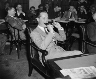 | Keywords: Robert Montgomery 1939 cropped.jpg Robert Montgomery before senate committee Washington D C April 3 The S R O sign was hung out today at the Senate Interstate Commerce Committee Hearing as Robert Montgomery movie star appeared to express his opposition to a bill designed to prohibit Block booking and Blind selling two trade practices which curb the discretion that a movie house owner has in selecting pictures to be shown in his community Speaking as a former President of the Screen Actors Guild Montgomery told the Committee that the Guild and their lawyers have come to the very definite conclusion that if the bill should become a law it would cut in half the production schedules of the Motion Picture Industry 4-3- 39 LOC-image hec 26407 Harris Ewing 1939-04-03 PD-Harris-Ewing Robert Montgomery 1939 tif PD-Harris-Ewing Robert Montgomery Men facing right and looking right |