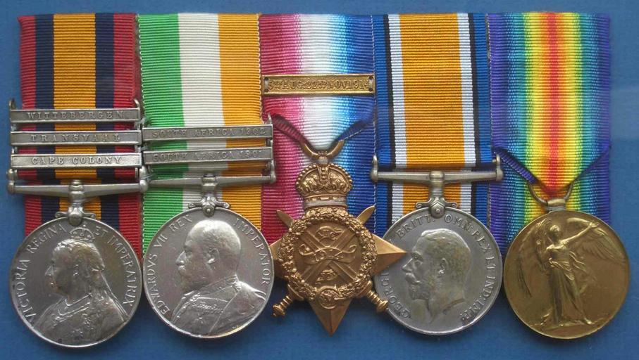 | Keywords: Robert O'Connor Campaign Medals.jpg Robert O'Connor of The Leinster Regiment <br> for his engagement in South Africa are left the 1900 Queens South Africa Medal and the 1902 Kings South Africa Medal then the three 1914-18 World War I Campaign Medals the 1914-15 Star the British War Medal and the Allied Victory Medal family possession permitted Osioni 2007-07 PD-UKGov Robert O'Connor Medal groups of the United Kingdom | ||||