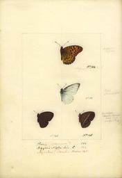 | Keywords: Robert Templeton Rhopalocera Ceylon Plate 26.jpg en Robert Templeton Rhopalocera of Ceylon Watercolour intended for publication in Transactions of the Royal Entomological Society of London Marginal identification notes by Francis Walker after 1859 the date of publication of A catalogue of the lepidopterous insects in the museum of the Hon East-India company by Thomas Horsfield and Frederic Moore of the East India Company London W H Allen and Co 1857-59 145 Mycalesesis samba Moore Mycalesesis perseus Fabricius 1775 144 Argynnis niphe Argyreus hyperbius Linnaeus 1763 151 Pieris Namoura Appias cf indra Own Scan Robert Templeton s 1840 PD-old Mycalesis perseus Argynnis hyperbius Appias Robert Templeton Butterflies of Ceylon |