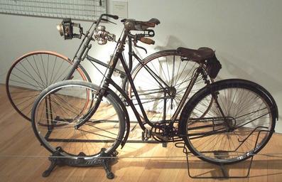 | Keywords: RobertsIvelSateyCycles.JPG en A Roberts safety bicycle rear made in 1889 and originally owned by Mr G A Geary and an Ivel safety bicycle front made in 1886 Both machines on display at Bedford Museum's Clocking In exhibition at the Bedford Gallery own Simon Speed 2010-04-01 Clocking In Exhibition Bedford Museum Vintage bicycles Photos by Simon Speed |