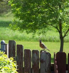 Keywords: robin singing summer spring sunny day outdoors yard backyard warm bright fence season tree nature environment