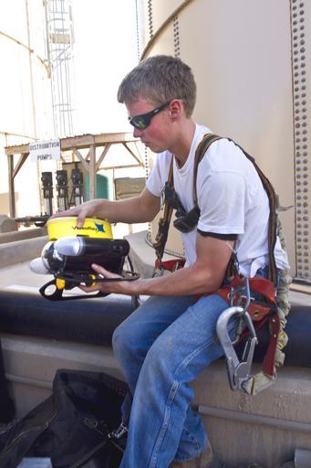 MAKE A MEME View Large Image Robotic inspection of water tanks DVIDS337673.jpg en Field Tech Noah Peyer of Tank Industry Consultants unpacks and inspects a remote operated vehicle beside a 200 000 gallon fresh water tank Nov 3 on Camp Lemonnier The ROV has a video ...