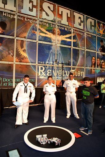 | Keywords: Robotics Day at HESTEC 141009-N-ND850-218.jpg en Lt Culinary Specialist 2nd Class Rodolfo Zepeda a recruiter with Navy Recruiting Station-Brownsville judges a head-to-head challenge in support of Robotics Day held during the 2014 Hispanic Engineering Science and Technology Week HESTEC on the campus of the University of Texas-Pan American UTPA Oct 9 Standing next to Zepeda is Cmdr Karen Muntean executive officer Navy Recruiting District San Antonio and Lt Joel Pena a diversity officer with Navy Recruiting Command ™s Diversity Office More than 60 middle and high school teams competed in the annual competition HESTEC Week is an educational conference that features events geared towards promoting science technology engineering and mathematics STEM education to people of all ages and backgrounds The theme for this year's conference is The STEM Revolution U S Navy photo by Burrell Parmer NRD San Antonio Public Affairs/Released 2014-10-09 Burrell Parmer https //www dvidshub net/image/1608048 141009-N-ND850-218 2014-10-09 15 02 EDINBURG TX US PD-USGov-Military-Navy United States Navy Recruiting Command Images from DoD uploaded by Fæ |