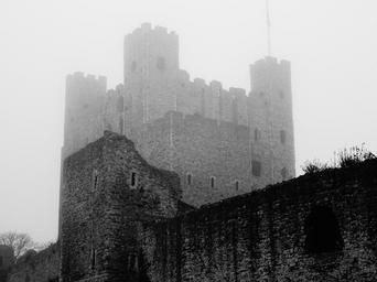 | Keywords: blackandwhite monochrome rampart architecture outdoor black and white Rochester Castle stands on the east bank of the River Medway in Rochester, Kent, South East England. The 12th-century keep or stone tower, which is the castle's most prominent feature, is one of the best preserved in England or France. Situated on the River Medway and Watling Street, Rochester served as a strategically important royal castle. During the late medieval period it helped protect England's south-east coast from invasion. The first castle at Rochester was founded in the aftermath of the Norman Conquest. It was given to Bishop Odo, probably by his half-brother William the Conqueror. During the Rebellion of 1088 over the succession to the English throne , Odo supported Robert Curthose, the Conqueror's eldest son, against William Rufus. It was during this conflict that the castle first saw military action; the city and castle were besieged after Odo made Rochester a headquarters for the rebellion. After the garrison capitulated, this first castle was abandoned. Between 1087 and 1089, Rufus asked Gundulf, Bishop of Rochester, to build a new stone castle at Rochester. He established the current extent of the castle. Though much altered through the centuries, some parts of Gundulf's work survive. In 1127 King Henry I granted the castle to the Bishops of Canterbury in perpetuity. William de Corbeil built the massive keep that still dominates the castle today. Throughout the 12th century the castle remained in the custody of the archbishops. During the First Barons' War (1215–1217) in King John's reign, baronial forces captured the castle from Archbishop Stephen Langton and held it against the king, who then besieged it. The Barnwell chronicler remarked "Our age has not known a siege so hard pressed nor so strongly resisted". After resisting for just over seven weeks, the garrison surrendered. Although the castle had been greatly damaged, with breaches in the outer walls and one corner of the keep collapsed, it was hunger that eventually forced the defenders' hand. The castle did not stay under John's control for long: in 1216 it was captured by the French Prince Louis, who was the new leader of the baronial faction. John died and was succeeded by his son King Henry III in 1216; the next year, the war ended and the castle was taken under direct royal control. Rochester was besieged for the third time in 1264 during the Second Barons' War (1264–1267). The castle's royal constable, Roger de Leybourne, held Rochester in support of Henry III. Rebel armies led by Simon de Montfort and Gilbert de Clare entered the city and set about trying to capture the castle. Again the castle's defenders resisted, though this time with a different outcome. After a week, the rebel armies raised the siege in the face of relief from Henry himself. Although the garrison did not surrender, the castle suffered extensive damage that was not repaired until the following century. The castle saw military action for the last time in 1381 when it was captured and ransacked during the Peasants' Revolt. As Rochester Castle fell out of use its materials were reused elsewhere and custodianship relinquished by the Crown. The castle and its grounds were opened to the public in the 1870s as a park. At various points during the 19th and 20th centuries repairs were carried out. The castle is protected as a Grade I listed building and Scheduled Monument. Today the ruins are in the guardianship of English Heritage and open to the public. Rochester Castle stands on the east bank of the River Medway in Rochester, Kent, South East England. The 12th-century keep or stone tower, which is the castle's most prominent feature, is one of the best preserved in England or France. Situated on the River Medway and Watling Street, Rochester served as a strategically important royal castle. During the late medieval period it helped protect England's south-east coast from invasion. The first castle at Rochester was founded in the aftermath of the Norman Conquest. It was given to Bishop Odo, probably by his half-brother William the Conqueror. During the Rebellion of 1088 over the succession to the English throne , Odo supported Robert Curthose, the Conqueror's eldest son, against William Rufus. It was during this conflict that the castle first saw military action; the city and castle were besieged after Odo made Rochester a headquarters for the rebellion. After the garrison capitulated, this first castle was abandoned. Between 1087 and 1089, Rufus asked Gundulf, Bishop of Rochester, to build a new stone castle at Rochester. He established the current extent of the castle. Though much altered through the centuries, some parts of Gundulf's work survive. In 1127 King Henry I granted the castle to the Bishops of Canterbury in perpetuity. William de Corbeil built the massive keep that still dominates the castle today. Throughout the 12th century the castle remained in the custody of the archbishops. During the First Barons' War (1215–1217) in King John's reign, baronial forces captured the castle from Archbishop Stephen Langton and held it against the king, who then besieged it. The Barnwell chronicler remarked "Our age has not known a siege so hard pressed nor so strongly resisted". After resisting for just over seven weeks, the garrison surrendered. Although the castle had been greatly damaged, with breaches in the outer walls and one corner of the keep collapsed, it was hunger that eventually forced the defenders' hand. The castle did not stay under John's control for long: in 1216 it was captured by the French Prince Louis, who was the new leader of the baronial faction. John died and was succeeded by his son King Henry III in 1216; the next year, the war ended and the castle was taken under direct royal control. Rochester was besieged for the third time in 1264 during the Second Barons' War (1264–1267). The castle's royal constable, Roger de Leybourne, he