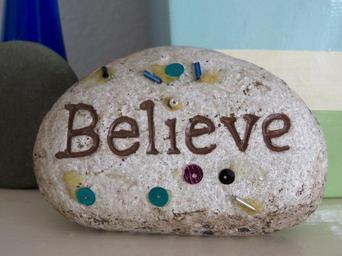 Keywords: rock art believe message fun garden stone unusual whimsical yard spiritual inspirational brown blue white green rubble pebble devotional craft sequence glue religious word paperweight