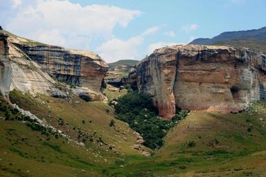 Keywords: rock formations rock sides cliffs layered earthy colors slopes green veld sky