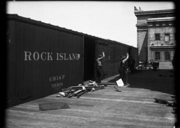 | Keywords: the field museum columbian move blackandwhite monochrome black and white Rock Island Railroad train car CRI&P 59304 with three or four men carrying a piece of glass for exhibit case into the new Field Museum. Office chairs in background. Moving from Field Columbian to new building. Museum move series. 1920. Original size and material: 5x7 inch glass negative Digital Identifier: CSGN40542 Part of the Illinois Urban Landscapes Project: www.fieldmuseum.org/urbanlandscapes/ Rock Island Railroad train car CRI&P 59304 with three or four men carrying a piece of glass for exhibit case into the new Field Museum. Office chairs in background. Moving from Field Columbian to new building. Museum move series. 1920. Original size and material: 5x7 inch glass negative Digital Identifier: CSGN40542 Part of the Illinois Urban Landscapes Project: www.fieldmuseum.org/urbanlandscapes/ |