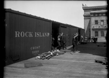 | Keywords: the field museum columbian move blackandwhite monochrome outdoor black and white Rock Island Railroad train car CRI&P 59304 with three or four men carrying a piece of glass for exhibit case into the new Field Museum. Office chairs in background. Moving from Field Columbian to new building. Museum move series. 1920. Original size and material: 5x7 inch glass negative Digital Identifier: CSGN40541 Part of the Illinois Urban Landscapes Project: www.fieldmuseum.org/urbanlandscapes/ Rock Island Railroad train car CRI&P 59304 with three or four men carrying a piece of glass for exhibit case into the new Field Museum. Office chairs in background. Moving from Field Columbian to new building. Museum move series. 1920. Original size and material: 5x7 inch glass negative Digital Identifier: CSGN40541 Part of the Illinois Urban Landscapes Project: www.fieldmuseum.org/urbanlandscapes/ |