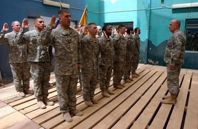 Keywords: 'Rock of the Marne' CG reenlists 17, Tuskers conduct awards ceremony DVIDS84861.jpg en Seventeen Soldiers from the 4th Battalion 64th Armor Regiment 4th Brigade Combat Team 3rd Infantry Division attached to the 1st Brigade Combat Team 4th Infantry Division Mulit-National Division - Baghdad recite their Oath of Re-enlistment April 18 before Maj Gen Rick Lynch commander 3rd Infantry Division and Multi-National Division - Center during an awards ceremony at Forward Operating Base Falcon Baghdad It's a true honor and privilege to re-enlist these fine Soldiers today Lynch said The Marne Division met their yearly retention goal in less than six months thanks to 3rd Inf Div Soldiers like the Tuskers Battalion said Lynch 2008-04-18 Sgt David Hodge https //www dvidshub net/image/84861 84861 2008-04-21 09 47 BAGHDAD IQ PD-USGov 3rd Infantry Division United States Images from DoD uploaded by Fæ
