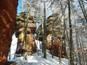 Keywords: rock palatinate sandstone winter holiday hiking mountain nature hike blue sky relax snow cold forest old castle rock trees landscape