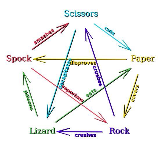 | Keywords: Rock Paper Scissors Lizard Spock en.svg en A diagram indicating which gestures beat which other gestures and by what action in a game of Rock-paper-scissors-lizard-Spock Made to replace w File Rock paper scissors lizard spock png with input from that file's talk page This diagram is in English es Un diagrama en inglés de la resolución del juego «Piedra papel tijera lagarto Spock » Own VidTheKid 2009-04-17 Rock Paper Scissors Lizard Spock es svg Rock Paper Scissors Lizard Spock it svg File Pierre ciseaux feuille lézard spock svg File Pierre ciseaux feuille lézard spock aligned svg The Big Bang Theory-related graphics Rock Paper Scissors Lizard Spock English text |