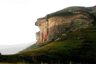 Keywords: rockface sandstone gold-pink earthy colors cliff green slopes soft light sky after storm landscape
