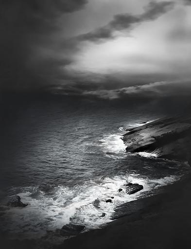 Keywords: rocks water waves coast line weather mood late evening landscape sky nature scenery magic light outside clouds black and white