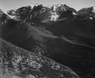 Keywords: rocky mountains colorado snow valley ravine landscape black and white sky clouds nature outside forest trees woods remote wilderness