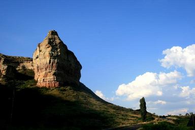Keywords: rocky outcrop clarens region sandstone earthy colors blue sky clouds lombardi poplar green slope road